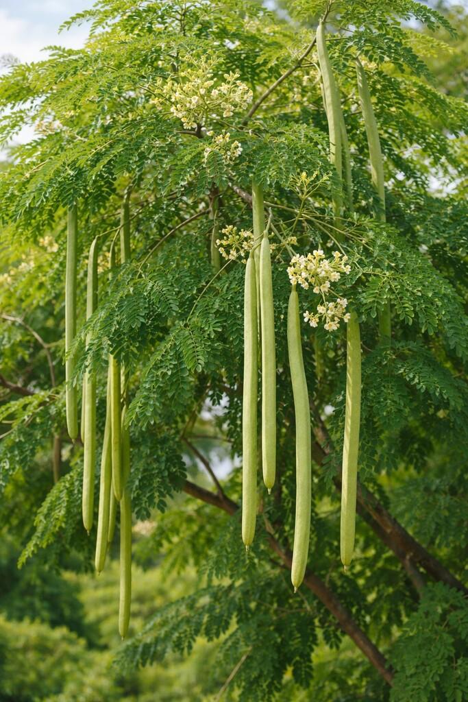 Das Bild zeigt Moringa Früchte, bei unserer Pflanzung von letzter Woche sieht man leider noch nichts.
